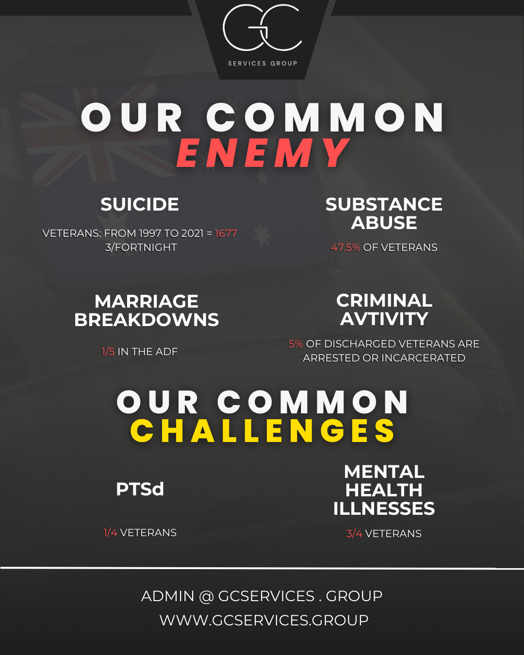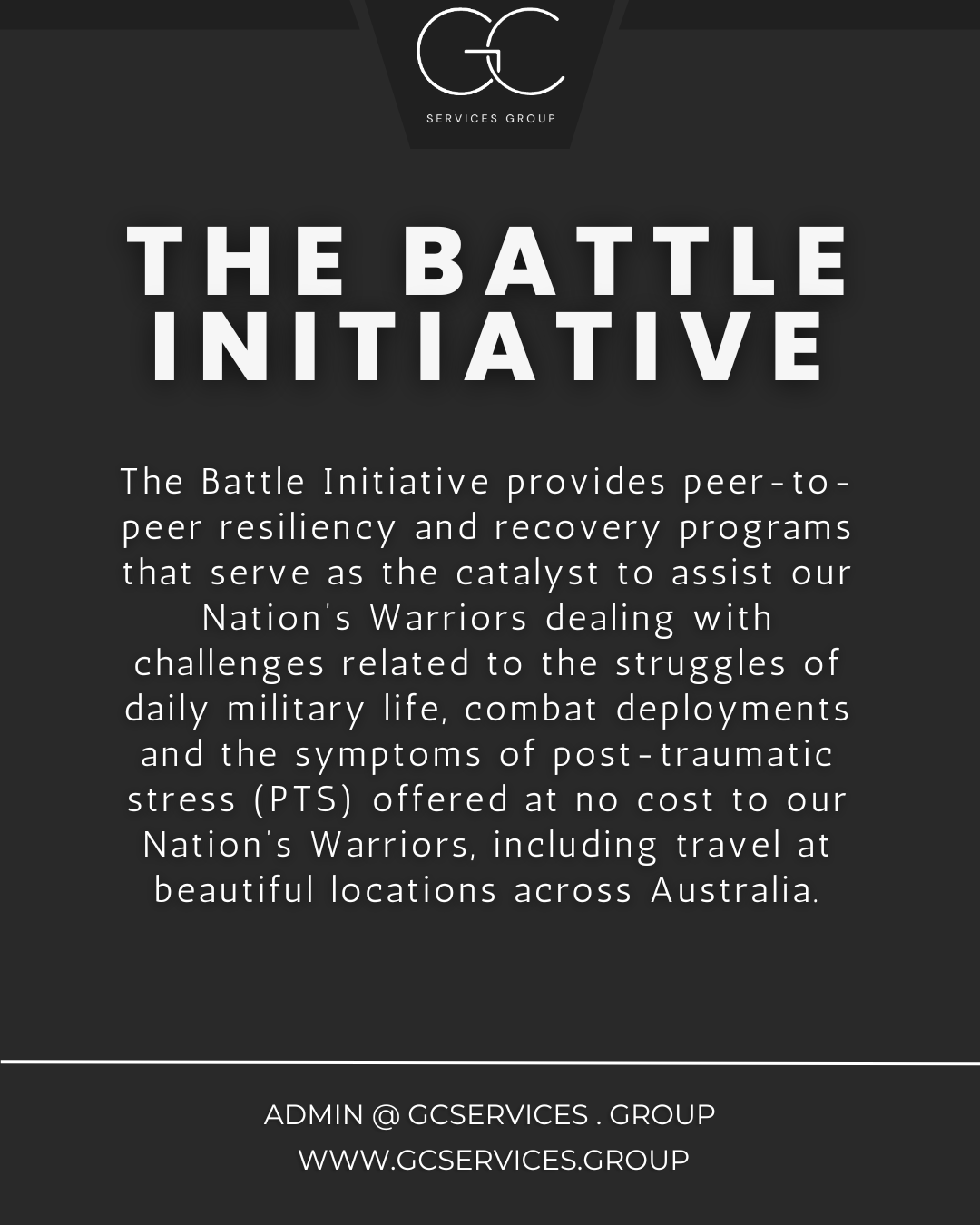 The Battle Initiative is doing work that saves lives and rebuilds families. Their mission brings hope to warriors who feel disconnected, overwhelmed or forgotten. GC Services Group is honoured to support their work and highlight their impact on the Australian veteran community.